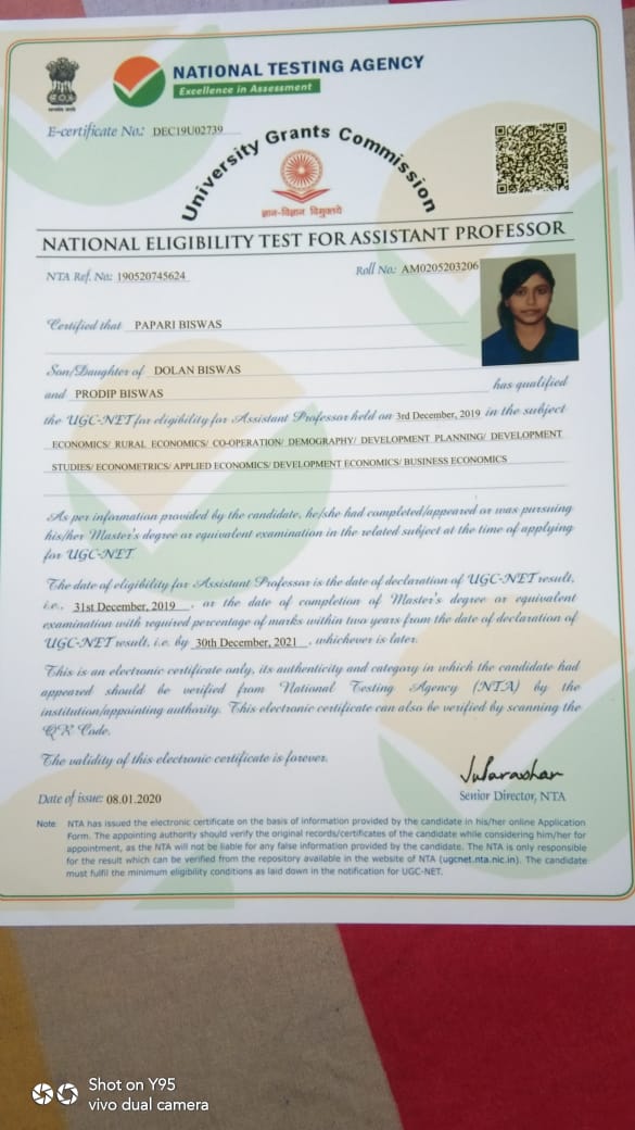 Dancer (NSQF Level 3) certificate of Epshita Barua